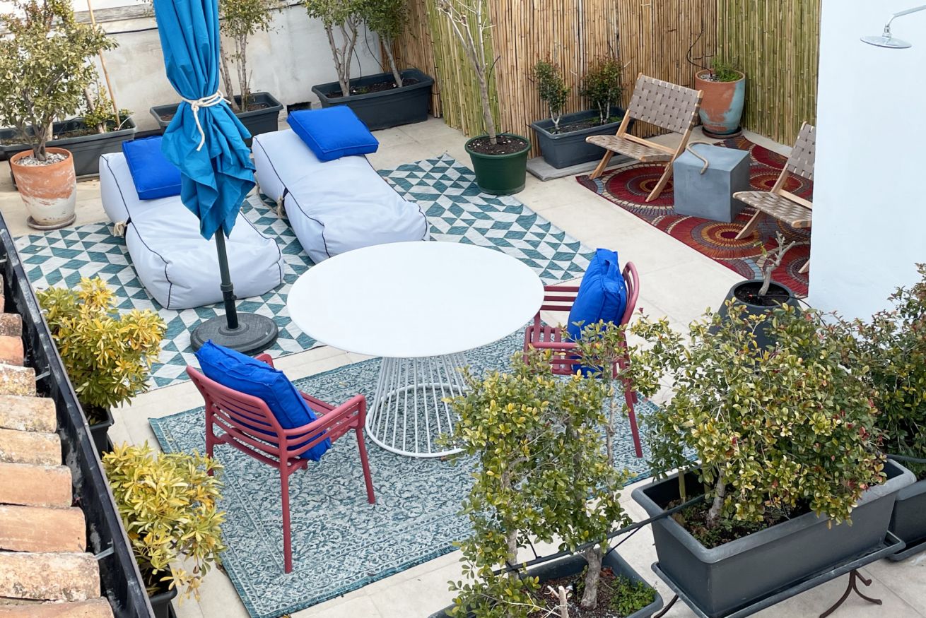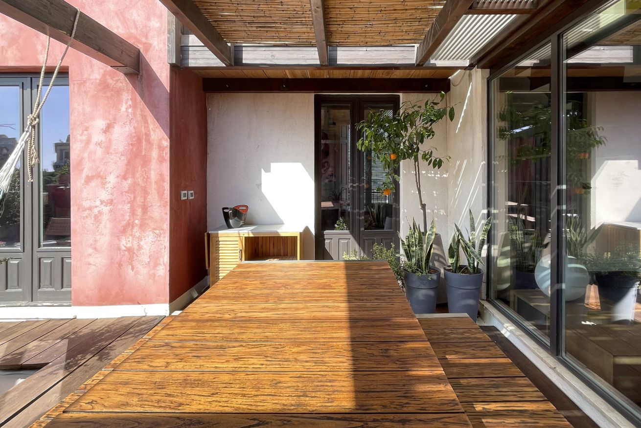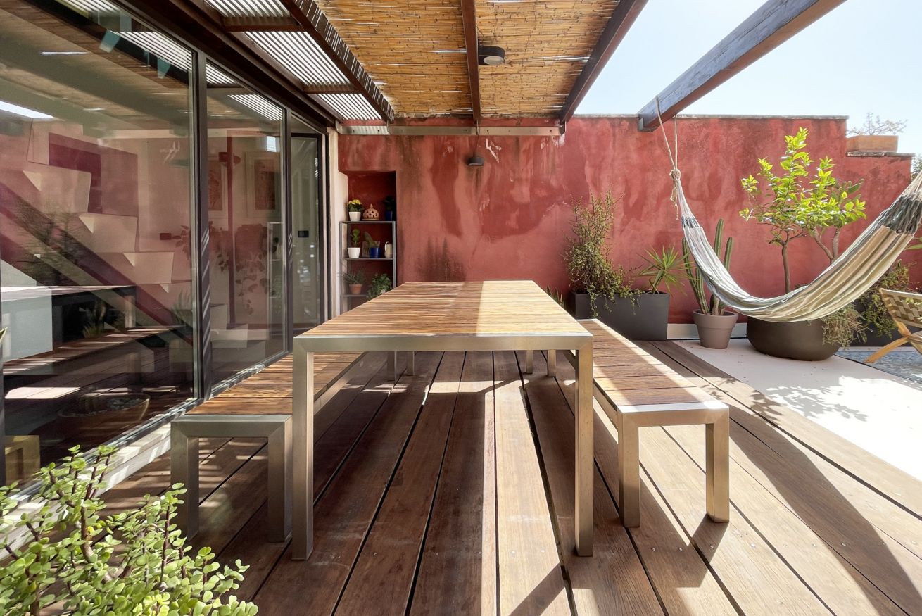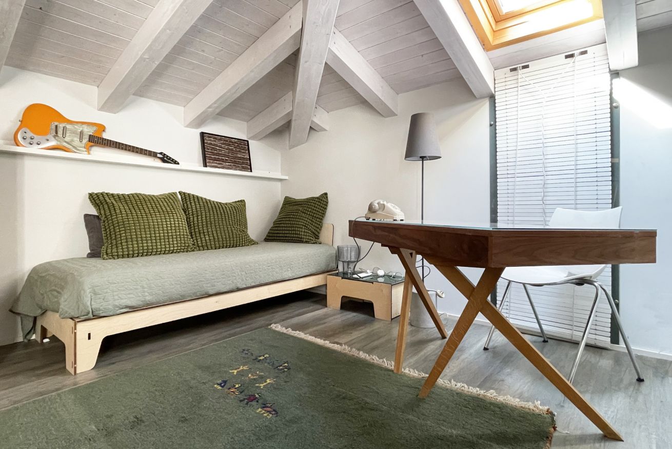 Located on the second floor of a building dating back to 1900, this apartment consists of two levels. The first level is wrapped around the roof garden and overlooks the medieval castle. An open space with a large living area, a lounge with a sofa and armchairs, an entertainment system (projector + surround sound system) and a dining area for six people. At the same level, there is an open entrance area, with direct views to the terrace and the castle, a large kitchen and a amazingly decorated bathroom. The "garden" is equipped with a teak table and benches / chairs that provide the ideal setting for dinners and for relaxing moments while sipping a glass of wine or reading a book in the hammock.